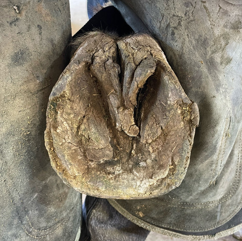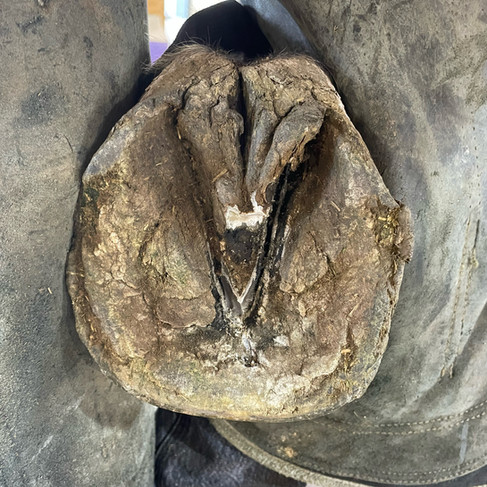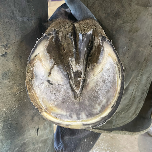 Why: Trimming the back of the frog is necessary to assess heel height and length, as well as balance. The back portion of the frog can become overgrown and fill the collateral sulci in the back of the hoof, this will cause the heel and frog to "blend" into one structure. If this extra growth is not trimmed out, you cannot safely and correctly trim the heels to the appropriate length, nor can you achieve balance. Remember: the heels and frog are two separate structures; there should be a clear distinction between the two.